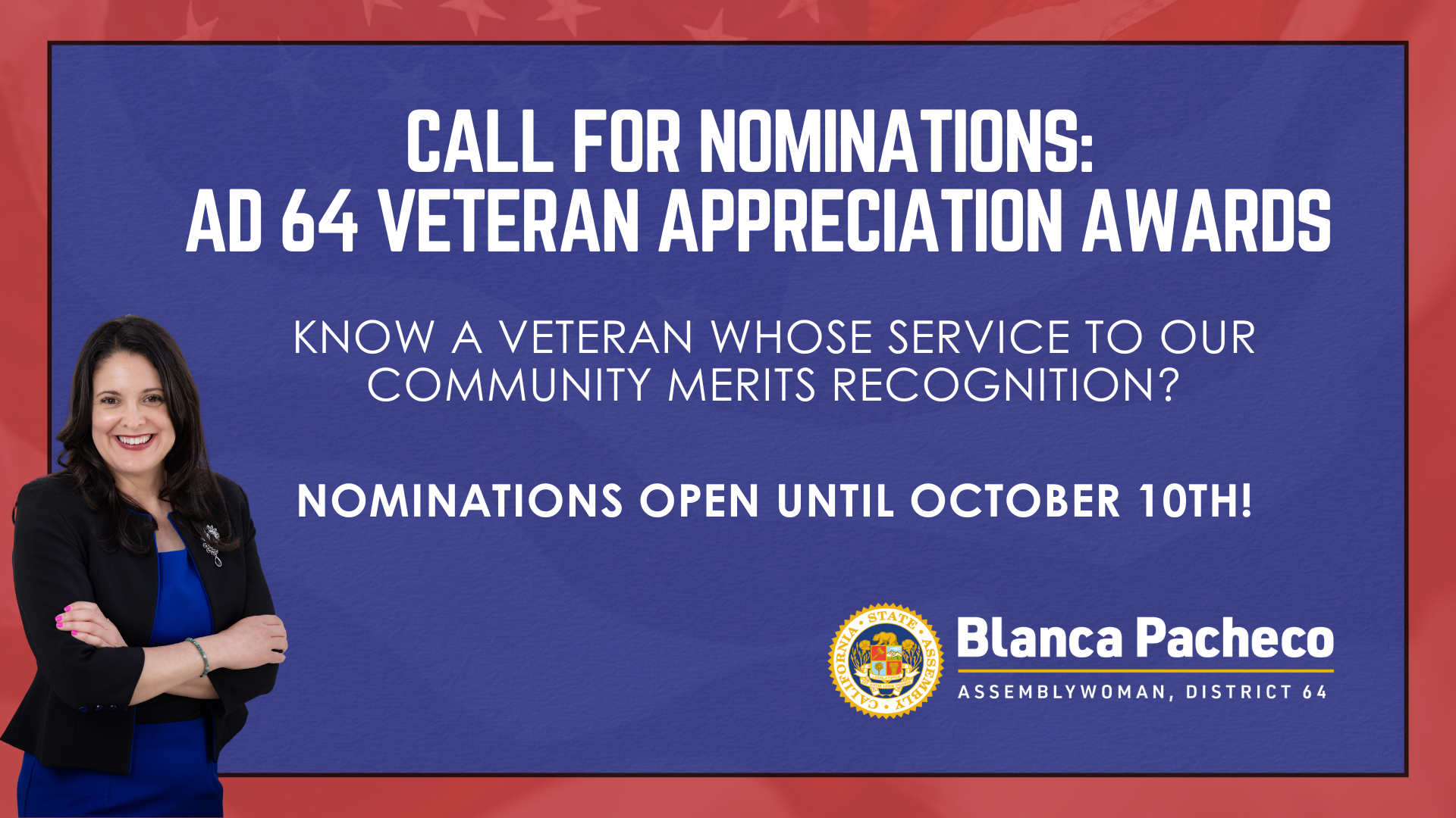 Nominations are now open for Assembly District 64’s second Annual Veterans Appreciation Awards! This honor celebrates local military veterans whose service and contributions continue to inspire.